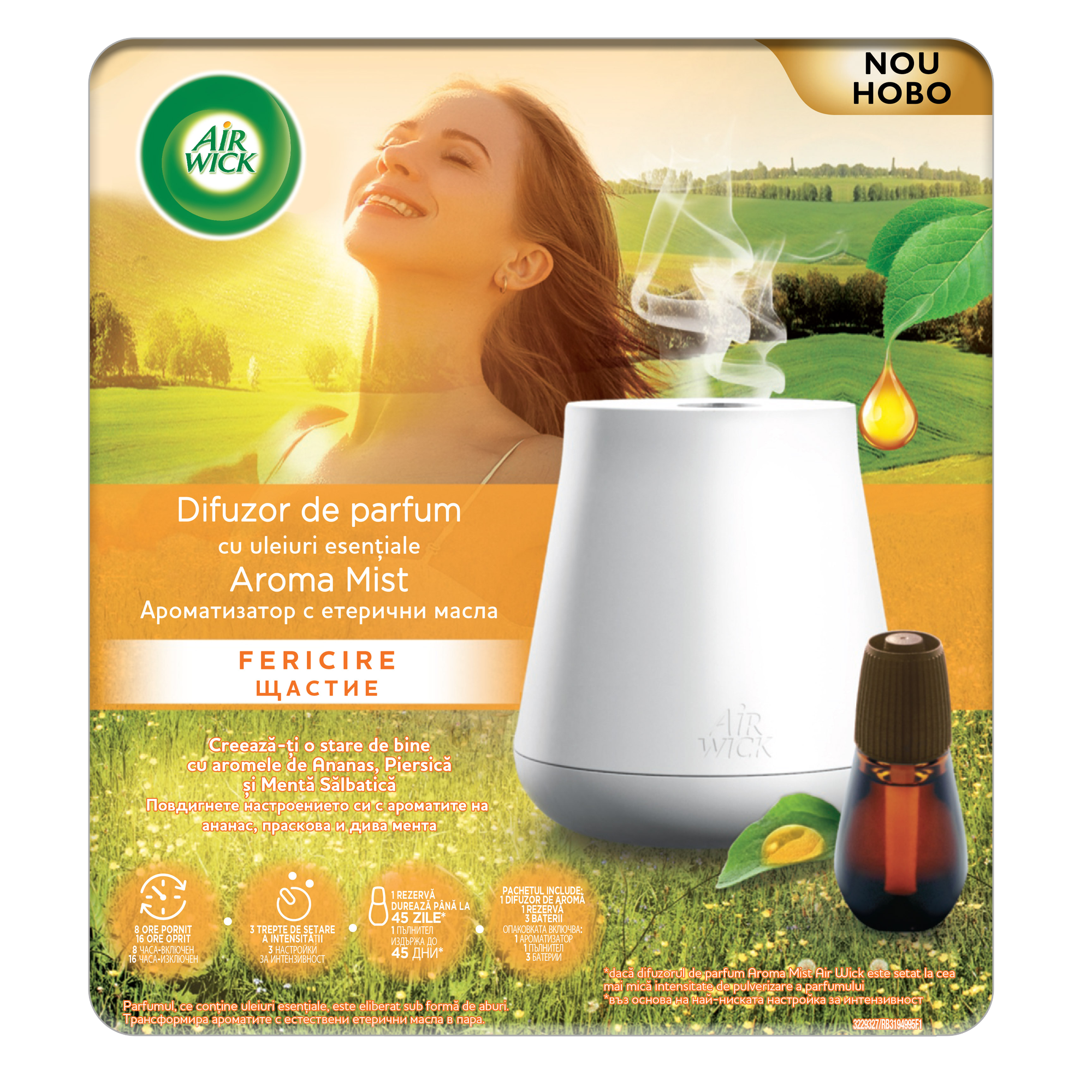 Air Wick Aroma Mist difuzor de parfum cu uleiuri esentiale cu note de ananas, piersica si menta salbatica – un odorizant de camera cu difuzor automat.