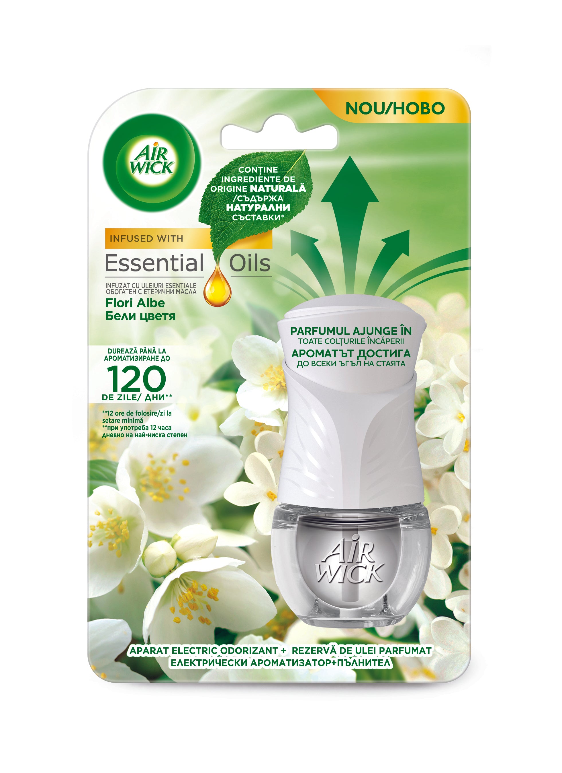 Parfum infuzat cu uleiuri naturale esentiale. Inundati-va casa cu un parfum minunat cu Air Wick Flori albe, frezie si iasomie. Dati viata aromei efervescente de frezie, liliac alb si iasomie alba delicata in floare.