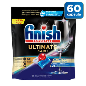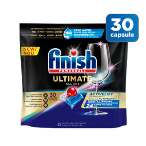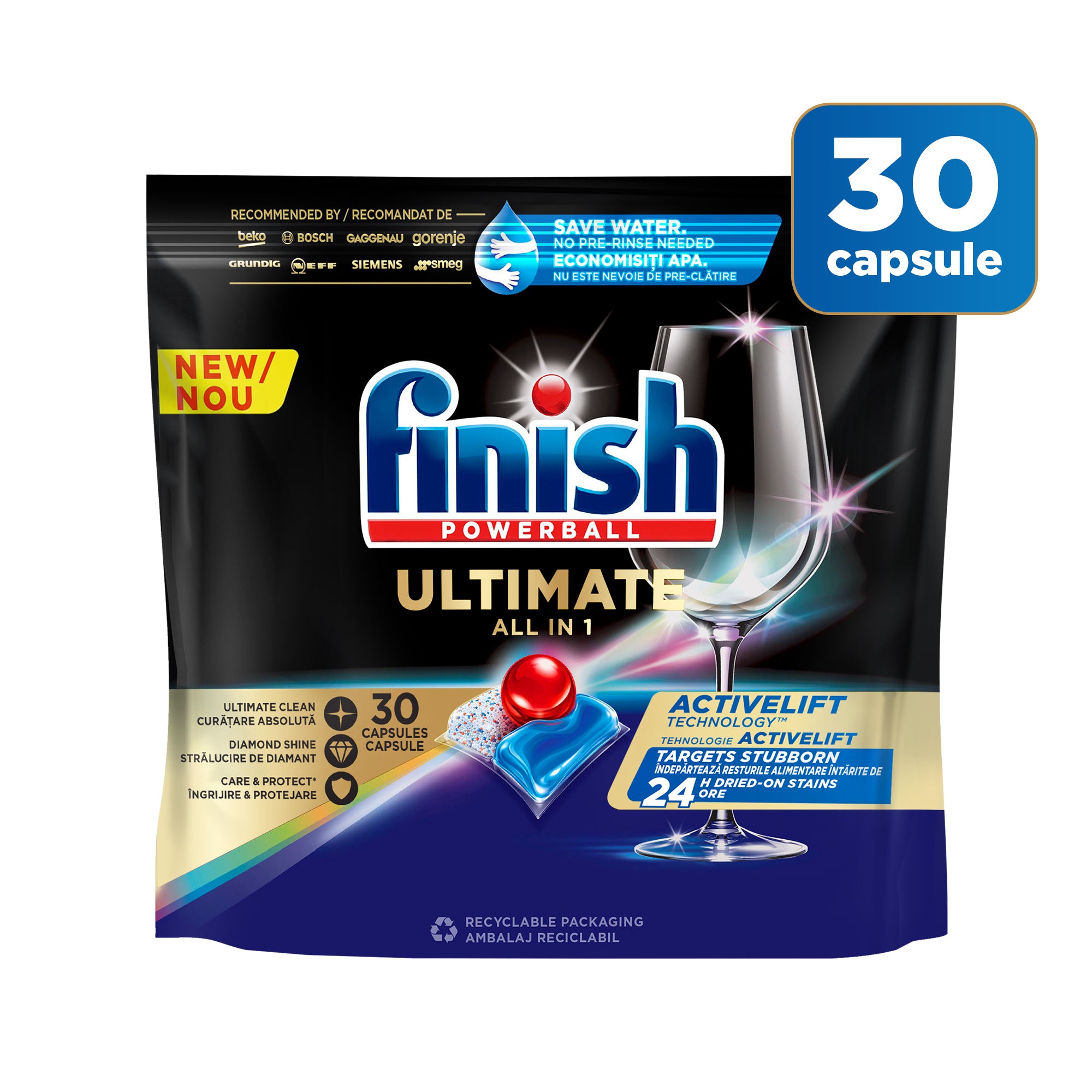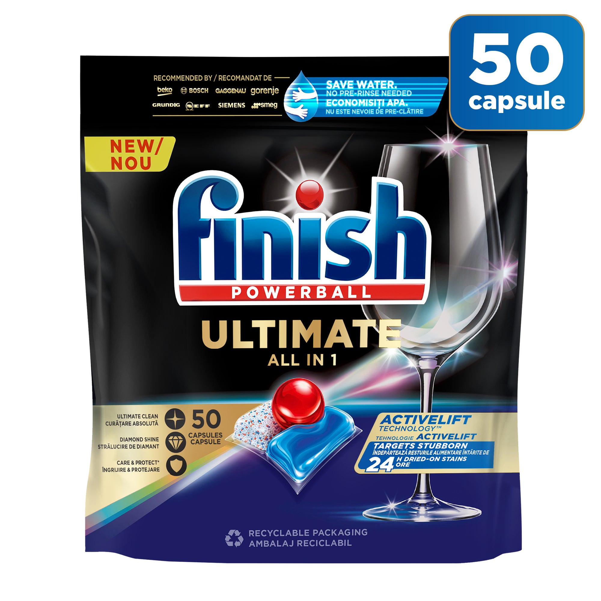 Detergentul pentru masina de spalat vase Finish Ultimate asigura curatare absolutasi indeparteaza resturile alimentare intarite de pana la 24 de ore.